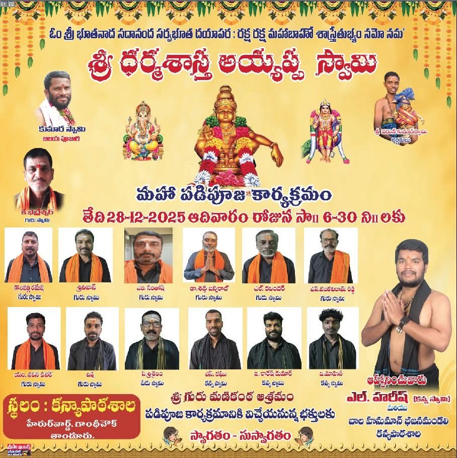 జనవాహిని ప్రతినిధి తాండూరు : తాండూరు పట్టణం హేరూర్ వార్డులోని కన్య పాఠశాల ఆవరణలో గల హనుమాన్ దేవాలయంలో ఆదివారం సాయంత్రం శ్రీ ధర్మశాస్త్ర అయ్యప్ప స్వామి మహా పడిపూజ మహోత్సవం అత్యంత వైభవంగా జరగనుంది. శ్రీ గురు మణికంఠ ఆశ్రమం కన్య స్వామి ఎల్. హరీష్ ఆధ్వర్యంలో నిర్వహించనున్న ఈ పూజా కార్యక్రమానికి సంబంధించి అన్ని ఏర్పాట్లు పూర్తయ్యాయి.ఆదివారం సాయంత్రం 6:30 గంటల నుండి స్వామివారికి విశేష అభిషేకాలు, పల్లకి సేవ, మరియు అత్యంత భక్తిశ్రద్ధలతో పద్దెనిమిది మెట్ల పూజను నిర్వహించనున్నట్లు నిర్వాహకులు తెలిపారు. పూజా కార్యక్రమాల అనంతరం భక్తులకు అల్పాహార వితరణ ఉంటుందని పేర్కొన్నారు. తాండూరు నియోజకవర్గంలోని అయ్యప్ప స్వాములు, భక్తులు పెద్ద సంఖ్యలో తరలివచ్చి స్వామివారి కృపకు పాత్రులు కావాలని బాల హనుమాన్ భజన కమిటీ ప్రతినిధులు ఒక ప్రకటనలో కోరారు.